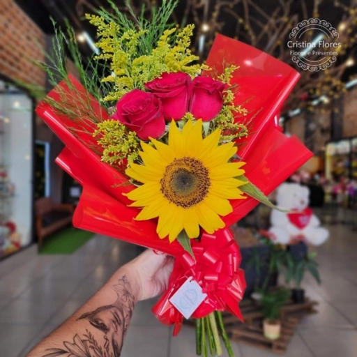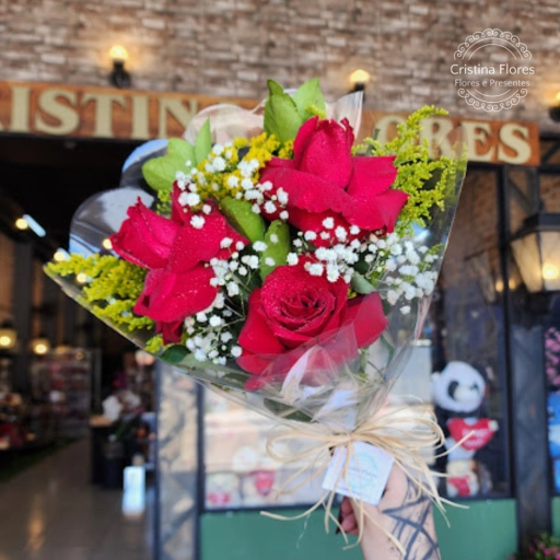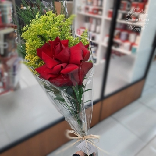 Buquezinho composto por 3 rosas nacionais vermelhas, com complemento variavel, finalizado no celofane transparente com l... Ver completo