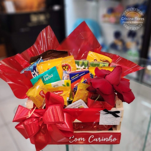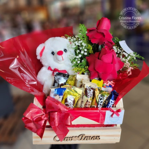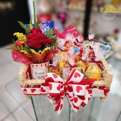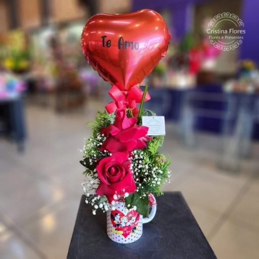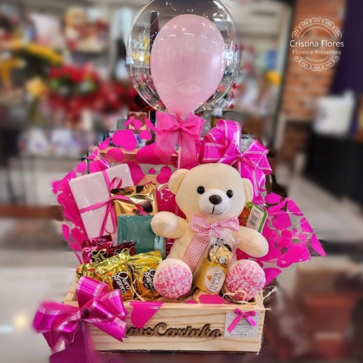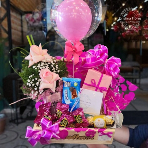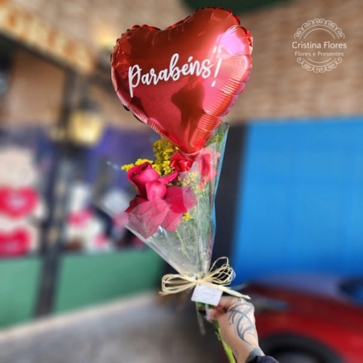 Duas rosas para simbolizar afeto, chocolates para adoçar o dia e um balão que celebra a vida.