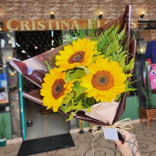 Três girassóis majestosos, montados em frente única para valorizar cada pétala dourada. No embrulho marrom elegante,... Ver completo