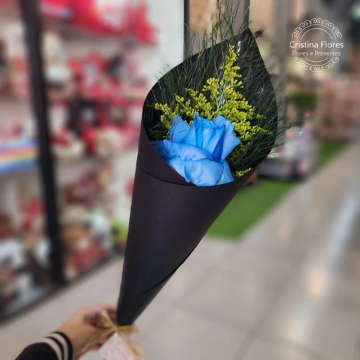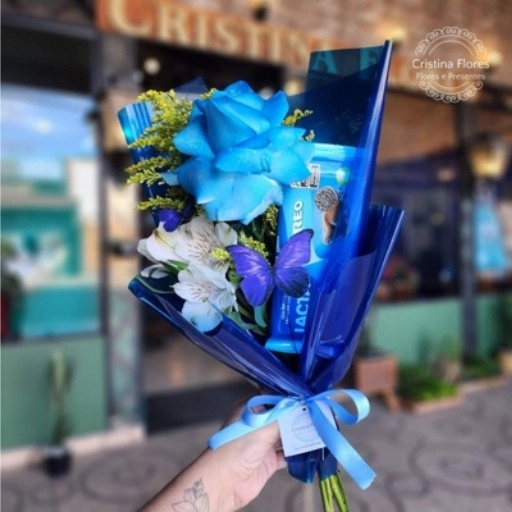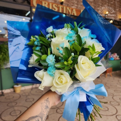 O Buquê Toque de Azul carrega a sensibilidade que o momento pede: 8 rosas brancas envolvidas por complementos azuis, cr... Ver completo
