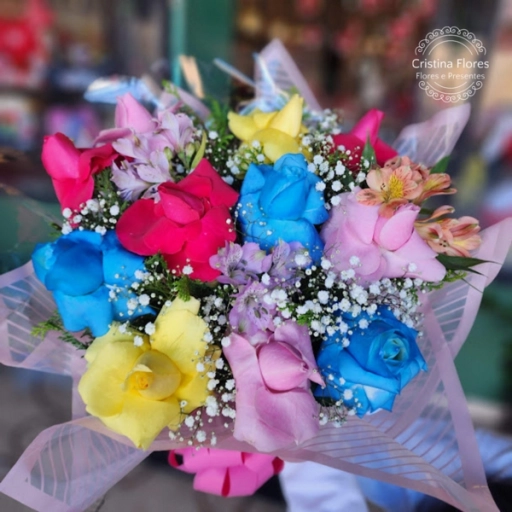 Composição: Média de 30 Rosas acompanhadas de Gipsofila, Aspargo, Cetim para acabamentos com laço. Brinde: buquê mi... Ver completo